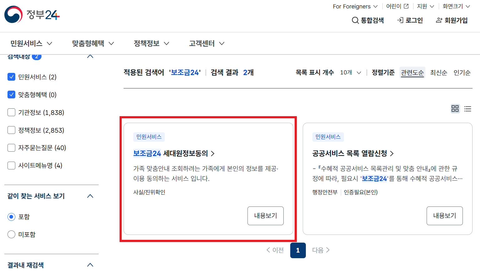 로그인 후 검색창에 ‘보조금24’를 검색하면, 본인에게 맞는 맞춤형 지원금 목록을 한눈에 확인할 수 있습니다.